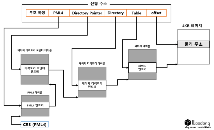 추가된 것이 PML4 (Page Map Level 4) 와 페이지 디렉토리 포인터이다.