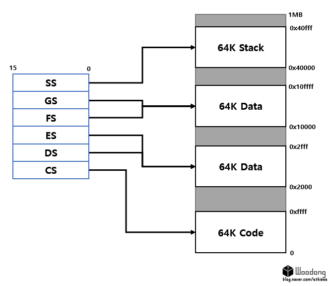 세그먼트의 시작 어드레스는 세그먼트 레지스터에서 직접 설정해준다.