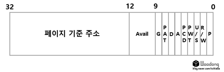 페이지 크기가 최소 4KB니까 비트 12 ~ 31로 기준 주소를 나타내고 하위는 속성 필드로 사용한다.