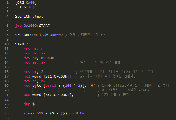 그래서 첫번째 섹터에 들어갈 코드만 구현해두면 그 뒤에 1023섹터에 대한 코드는 아주 손쉽게 구현할 수 있다.
