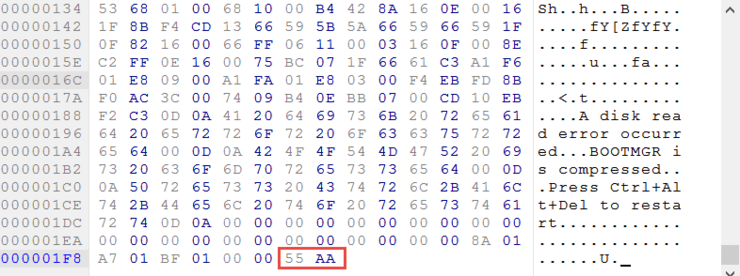 마지막 코드가 0x55 0xAA 인지 확인하면 이게 부트로더인지 일반 저장 매체 디스크인지 판별할 수 있다.
