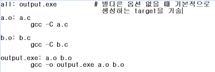 위 예제는 a.c 와 b.c 소스파일을 gcc로 빌드하여 output.exe를 생성하는 makefile이다.
