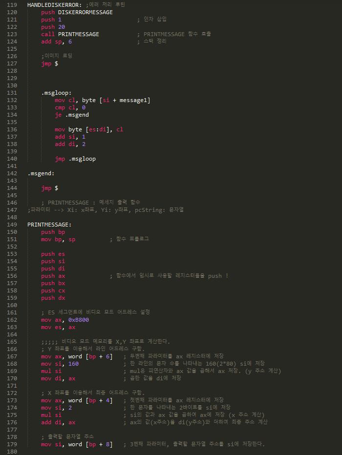 이렇게 함수 구현까지 완료 했다. 이제 지금까지 작성한 코드들을 합쳐 간단한 부트로더를 완성해볼 것이다.