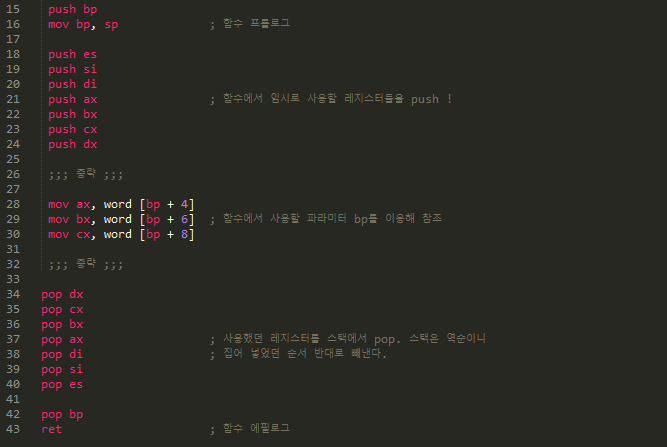 함수에서 사용할 레지스터, 스택 정리, 파라미터 받는 코드 정도 구성하면 된다.