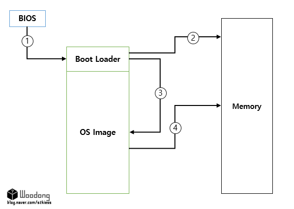 최초에 BIOS가 부트로더를 메모리에 로딩시키고 부트로더가 OS이미지를 메모리에 로딩시키는