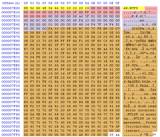위 그림은 NTFS VBR 영역을 디스크 덤프 뜬 것이다.