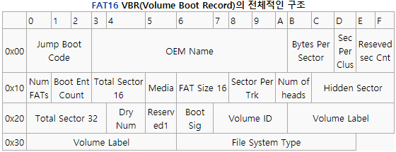아래 그림은 FAT16의 VBR 구조이다. FAT16이 가장 간단한 구조를 갖고 있기 때문에 예시로 사용하였다.