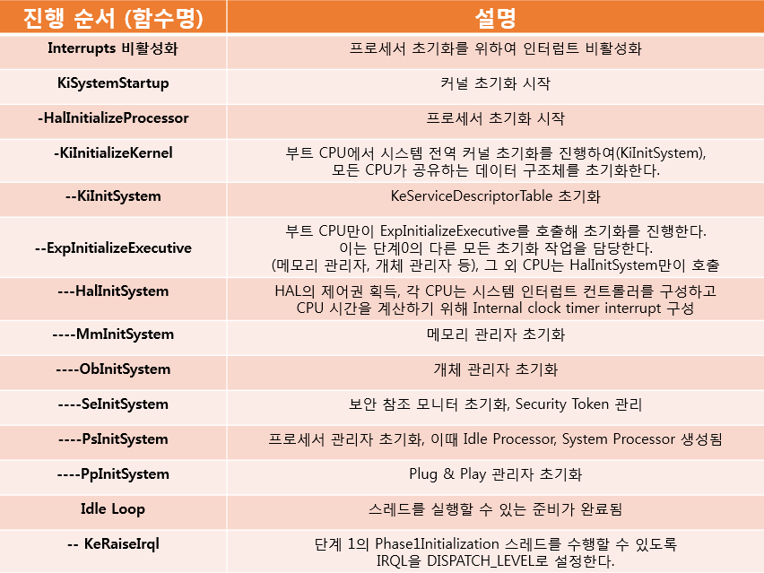 0단계 에서 인터럽트를 비활성화 하고, Ntldr( or Winload.exe) 에서 온 정보를 통해 KiSystemStartup 커널 함수를 호출한다.