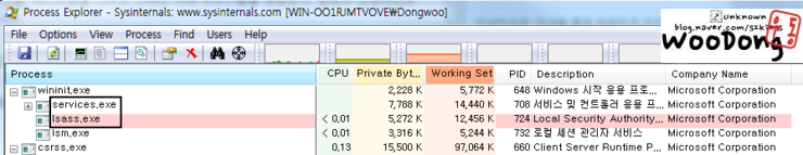 windows7 에서 Wininit.exe 가 Servcies.exe 와 Lsass.exe를 관리하는 것을 확인할 수 있다. ( process explorer )
