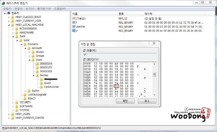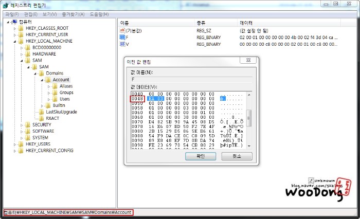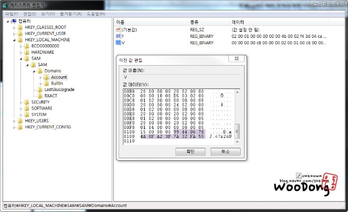 일단.. HKLM\SAM\SAM\Domains\Account로 가면 V 값이 있을 것이다. 이 값의 마지막 12바이트가 SID이다.