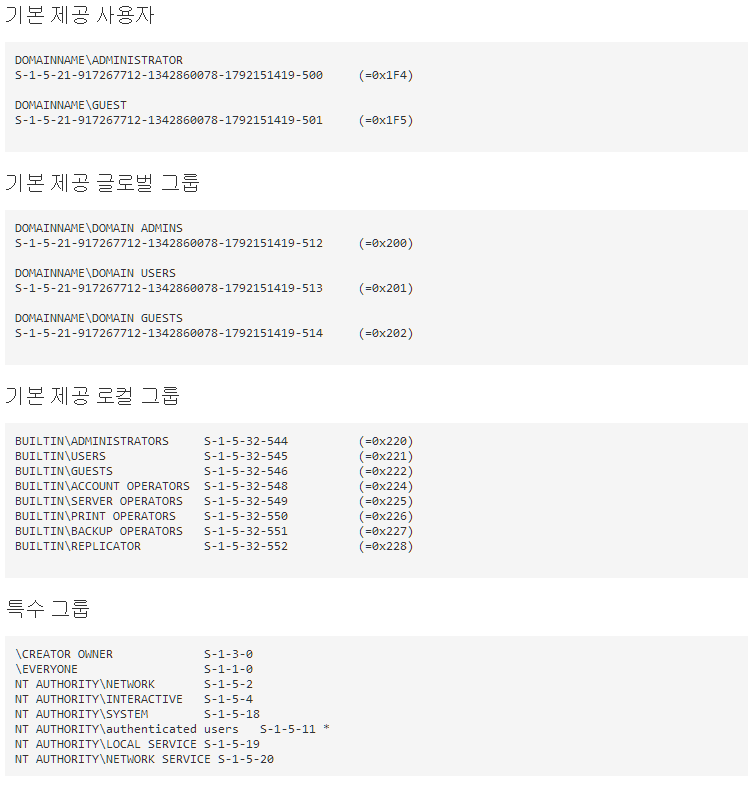 e.g.) S-1-1-0 = null(Everyone을 의미함)