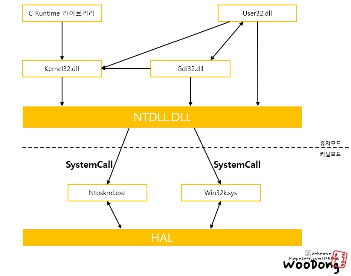 그럼 일단 Ntdll.dll 이녀석이 중간다리 역할을 하는 과정은 어떤지 위에 그림 보다 상세히 알아보겠음.