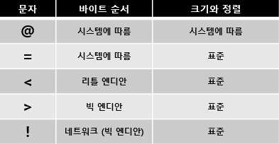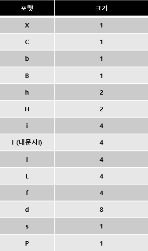 struct 모듈의 기능을 사용하기 위해 파이썬에서 지정해둔 포맷 스트링있다. C언어의 %d 같은 것들.