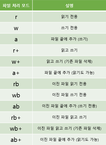 이건 파일을 처리하는 모드이다. w는 write, r는 read 전용