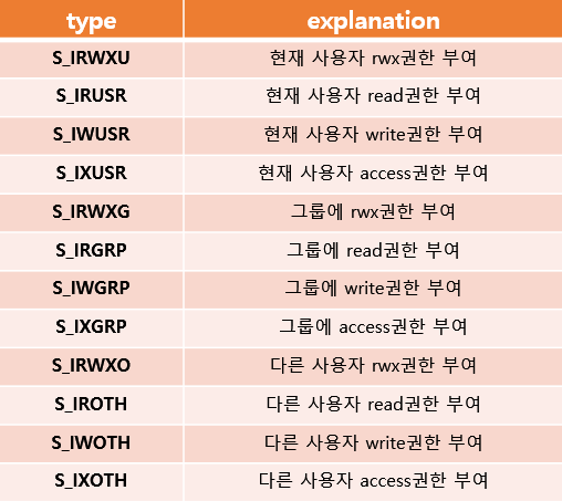 (mode_t는 파일 접근권한을 부여하기 위한 플레그값을 가진 구조체이다.)