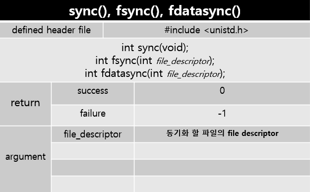 파일 디스크립터에 해당하는 파일에만 동기화가 적용된다. 이 함수는 쓰기가 완료될 때까지 기다렸다가 반환된다.