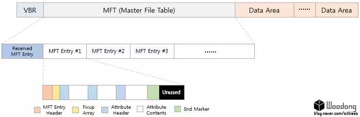 MFT 파일은 MFT 엔트리들로 구성이 돼있는데, 이 MFT 엔트리는 볼륨에 저장된 파일/디렉토리 하나하나 마다 1개 이상 할당된다. 그러므로 크기도 가변적이다. 그리고 MFT 엔트리 앞 부분에 MFT 파일의 메타데이터들이 들어있는 예약된 MFT 엔트리가 위치한다. MFT 자체도 파일이기 때문에 그 것의 메타데이터가 필요하다. 그것이 맨 앞에 할당됨