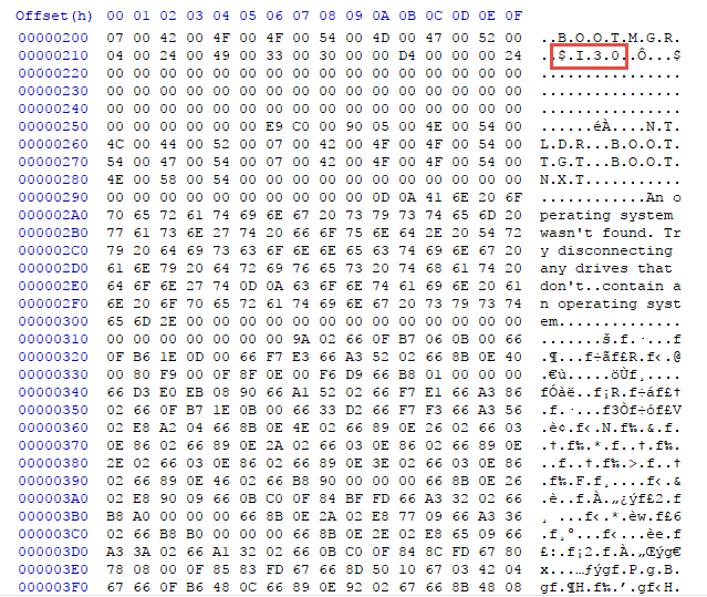 네모 박스친 부분은 NTFS $FILE_NAME 속성의 인덱스 이름이다. 쉽게 말해, 부트로더가 저장된 위치를 가르키는 것,
