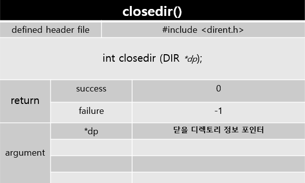 정보를 읽었으니 닫아야 할 것이 아닌가. 이것 또한 opendir 에서 반환된 포인터를 인자로 갖는다.