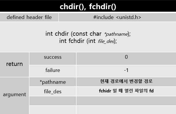 현재 프로세스의 경로를 변경시키는 함수가 chdir 이다.