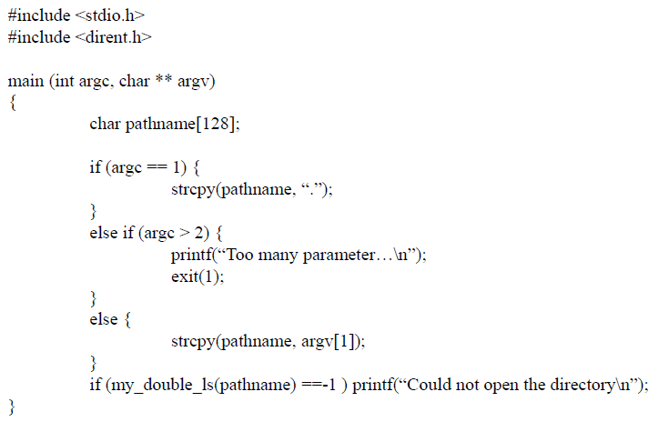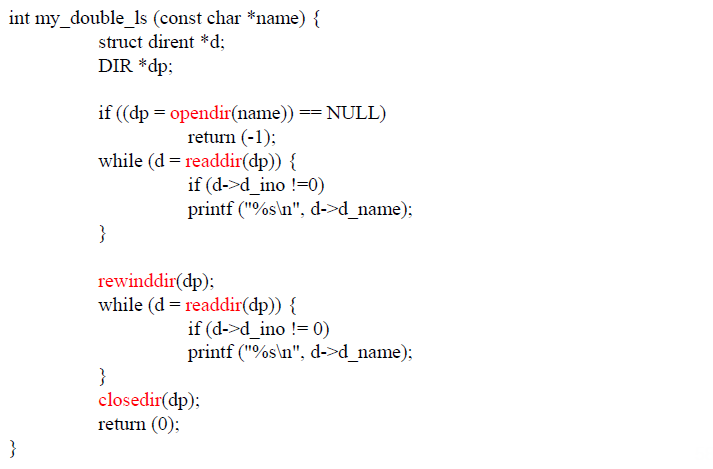 위 코드는 readdir()을 디렉토리가 끝날 때 까지 읽고 rewinddir()로 처음으로 돌아가 다시한번 더 디렉토리를 읽고