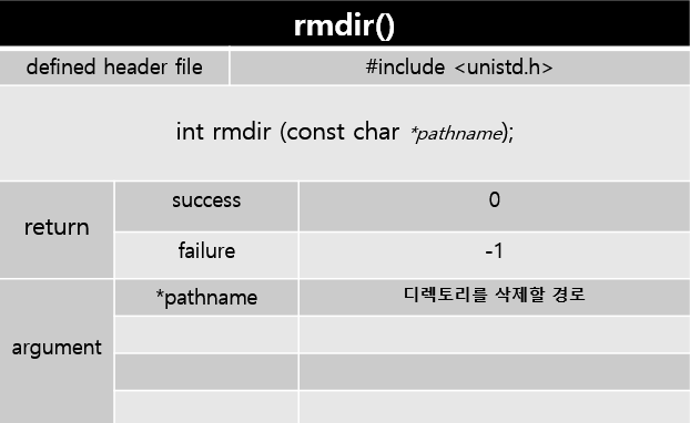 권한에 대해 설정할 때 읽기,쓰기만 설정하고 실행권한을 설정안하면 디렉토리 안에 있는 파일에 대해 접근이 불가능하다.(주의) ,,, 다음 디렉토리를 삭제하는 rmdir 함수이다.