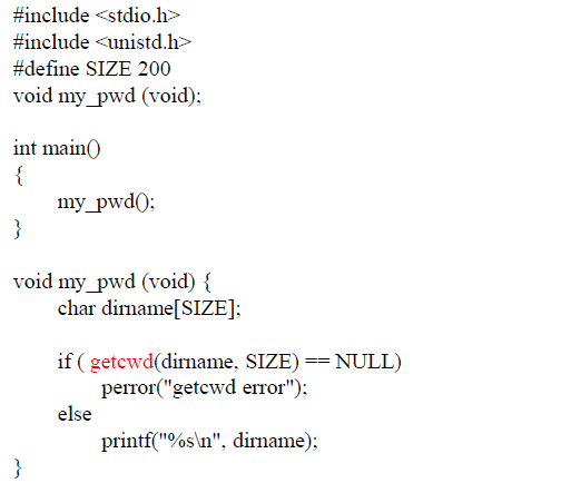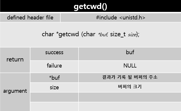 현재 디렉토리의 전체 경로 문자열을 저장할 buf를 반환한다. size를 넉넉하게 잡아주지 않으면 오류가 난다..