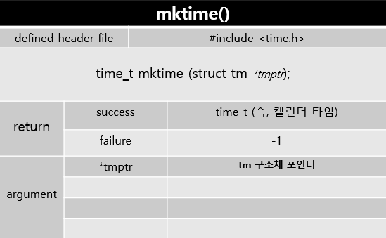 mktime은 반대 과정, tm 구조체에서 time_t 로 바뀌는 것이다. 하나씩 보자.