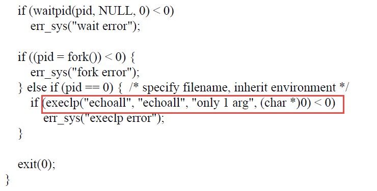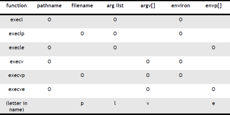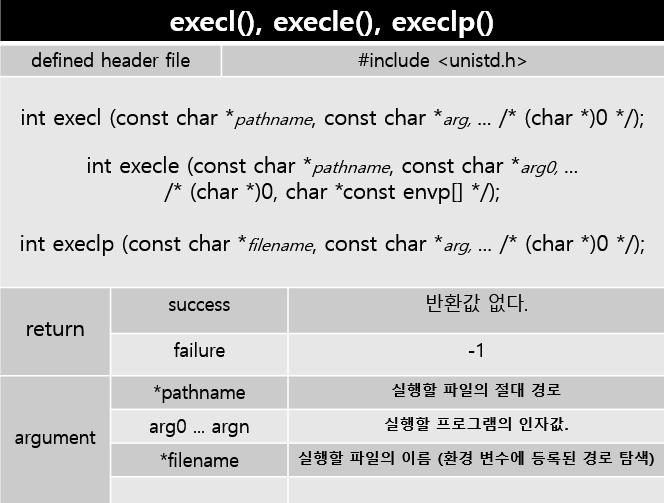 위 세가지 함수들은 실행될 프로그램의 인자를 받고 마지막에 널포인터를 지정해줘야 한다.