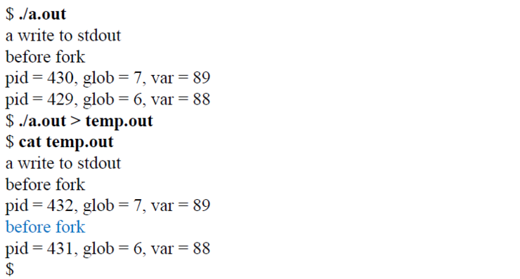 터미널에 바로 실행할 때는 printf는 줄단위 버퍼링이 적용되므로, "before fork\n" 의 개행문자(\n)를 만나면 flush 되어