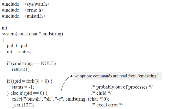 system함수는 fork, execl, waitpid 함수의 조합으로 구현되었다.