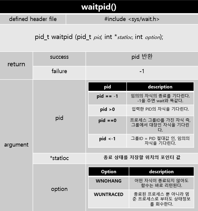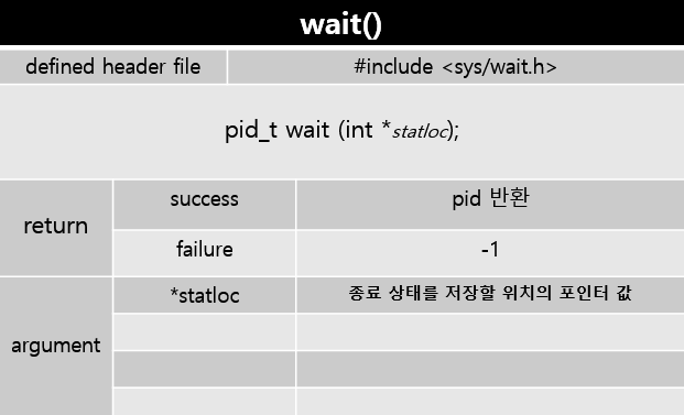 부모는 여러개의 자식프로세스를 가질 수 있고 별도의 자식pid를 알아낼 함수가 존재하지 않는다.