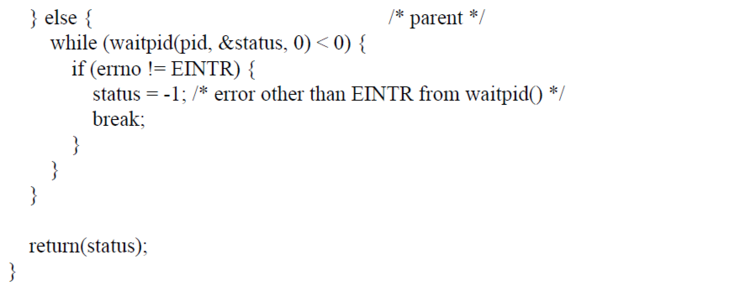 1. fork함수가 실패하였을 경우와 waitpid가 EINTR 이외의 오류코드를 돌려준 경우