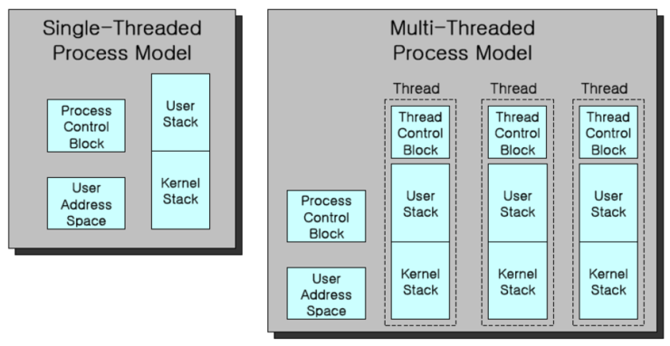 그림을 보면 하나의 프로세스에 여러개의 스레드들이 할당되어 있음을 알 수 있다.