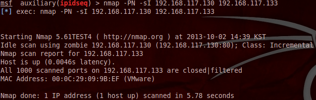 좀비로 192.168.117.130 을 사용하면 될 것 같다. ipidseq 모듈이 그렇게 말하고 있다(!)