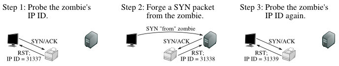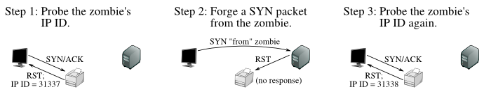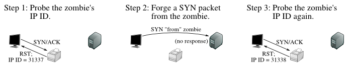 좀비 시스템에다가 밑도 끝도 없이 SYN/ACK를 보낸다. 좀비는 "이게 뭐지?" 하면서 RST로 답한다.