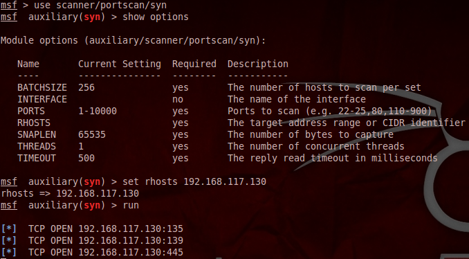 간단하게 syn스캔을 해보자. msf> use scanner/portscan/syn