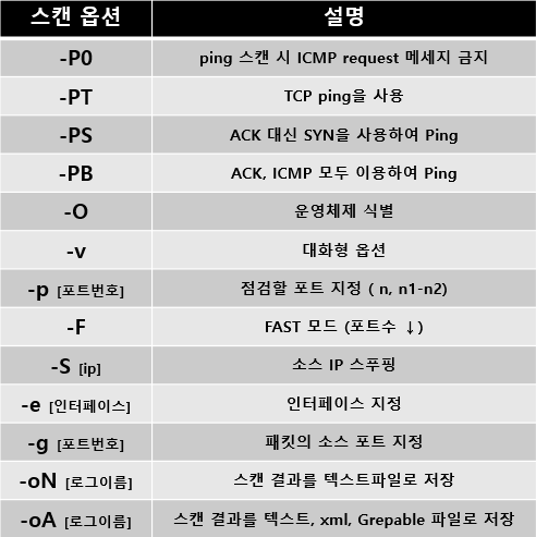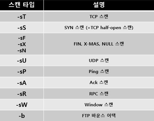 아래는 nmap에서 자주 사용되는 스캔 타입이다.