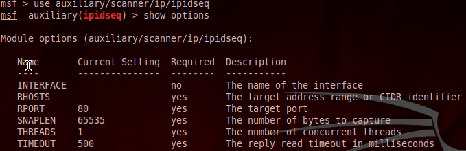 메타스플로잇에 접근 후 msf > use auxiliary/scanner/ip/ipidseq 입력한다.
