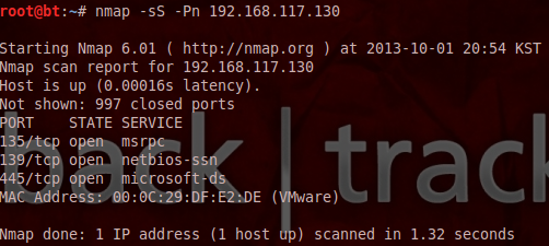 nmap -sS -Pn [IP 주소] : -sS(TCP 스텔스 스캔) -Pn(핑을 사용하지 않고 동작중인 상태 확인)