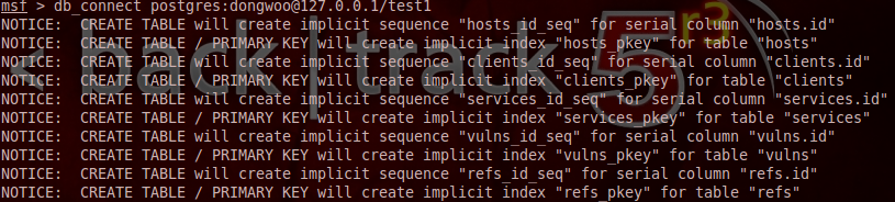 설정 후 메타스플로잇을 실행하여 #db_connect postgres:비밀번호@127.0.0.1/[db이름] 을 입력하여
