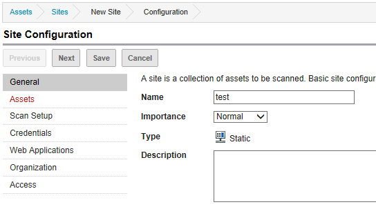 스캔할 사이트를 생성한다. 이름과 설명을 적는다. 다 기재하였으면 next를 클릭하여 다음 단계로 간다.