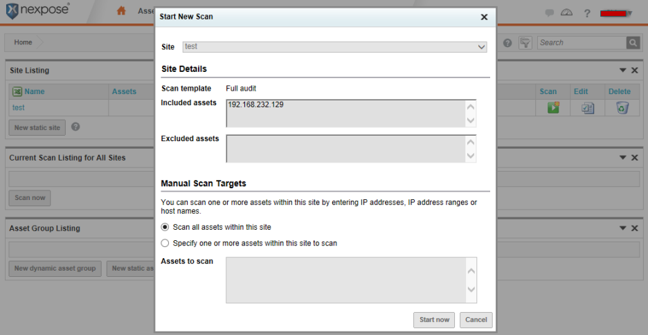 간단한 스캔에 대한 설정을 하고, 설정된 타겟이 맞는지 다시 한번 확인한 후 "start now"를 클릭한다.