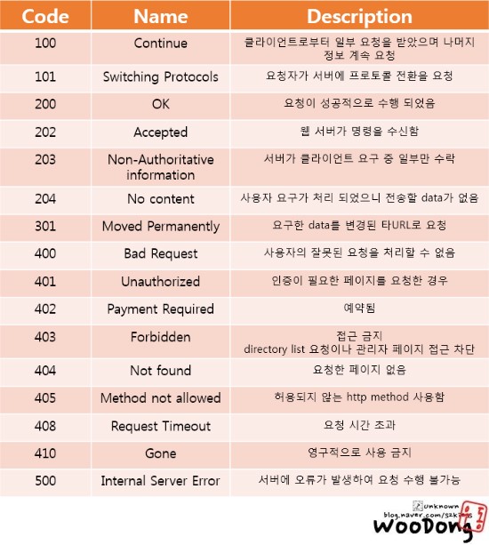 응답 코드는 더 설명할 것이 없다. 서버에서 클라이언트로 통보하는 것이므로.. 그냥 수긍하면 된다.