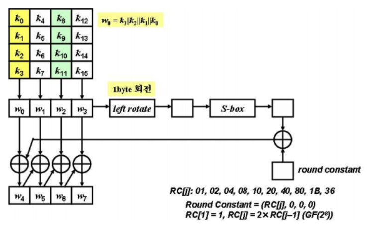 AES에서 사용하는 키 길이가 128이면 총 4개의 32비트 워드로 확장되어 라운드키로 사용할 수 있다.