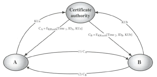 (1) A가 B의 공개키에 대한 요구를 타임스탬프 값과 함께 기관에 전송한다.