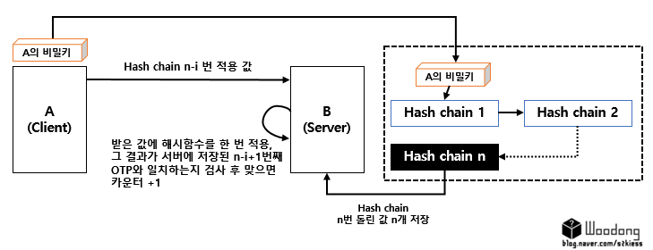 해시체인을 이용하여 인증할 때마다 다른 비밀번호를 사용하도록 그렇게 설계되었다.