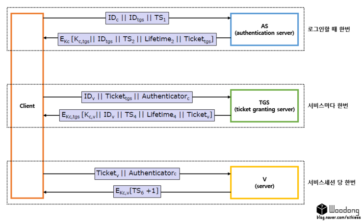 일단 Needham과 Schroeder의 프로토콜에 기반하고 있다고 했다. 고로 세션키 분배, 타임스탬프, 인증자 개념이 있겠지.