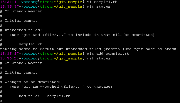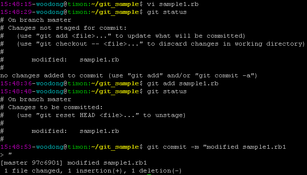 $git add sample1.rb 명령으로 다시 git 에서 수정한 내용을 자세히 파악할 수 있도록 한다.
