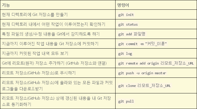 아래는 지금까지 익힌 명령어들을 정리한 표이다.